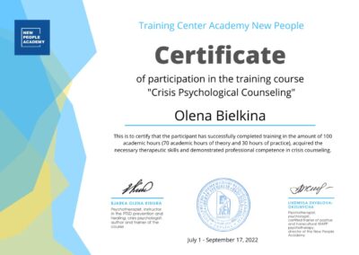 - Training Center “New People Academy” — Certification Course in Crisis Psychological Counseling (100 hours), Crisis Psychological Counselor Certificate